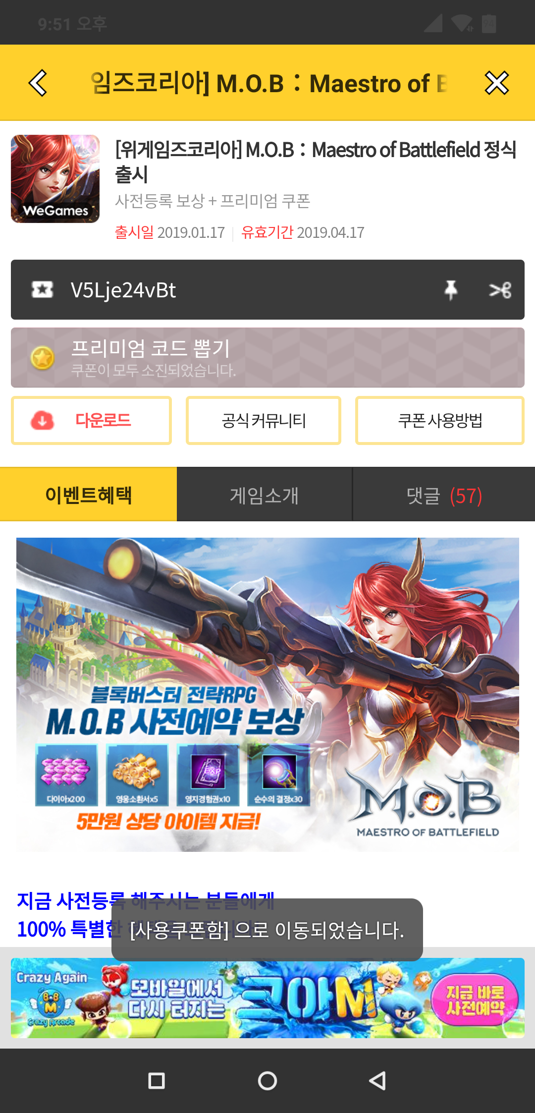 | MOB 사전등록쿠폰 드립니다. (0) | 2019.04.05 |