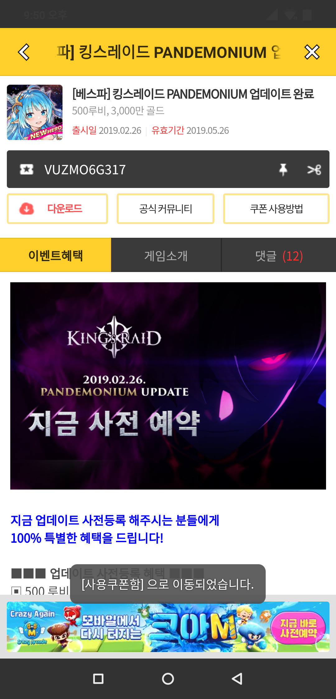 킹스레이드 업데이트 쿠폰 드립니다.