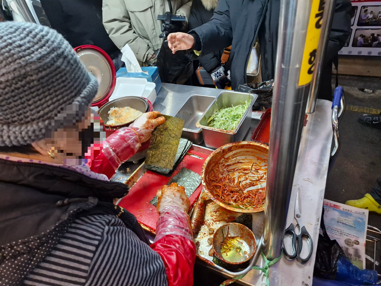파절이 삼겹살 김밥에서 김밥을 사려고 줄을 섰어요.,