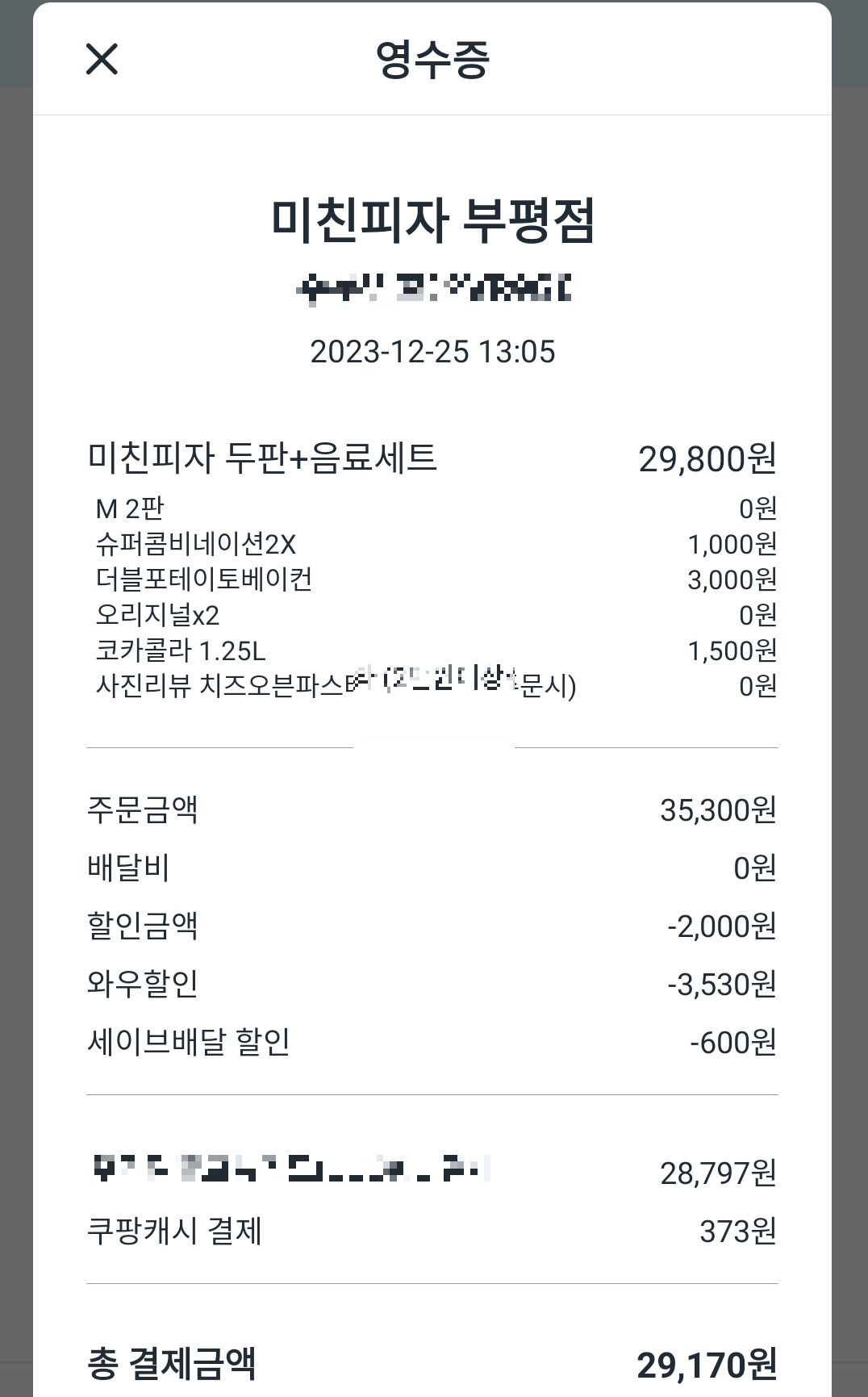 미친피자 부평점에서 쿠팡이츠로 배달 주문했습니다.