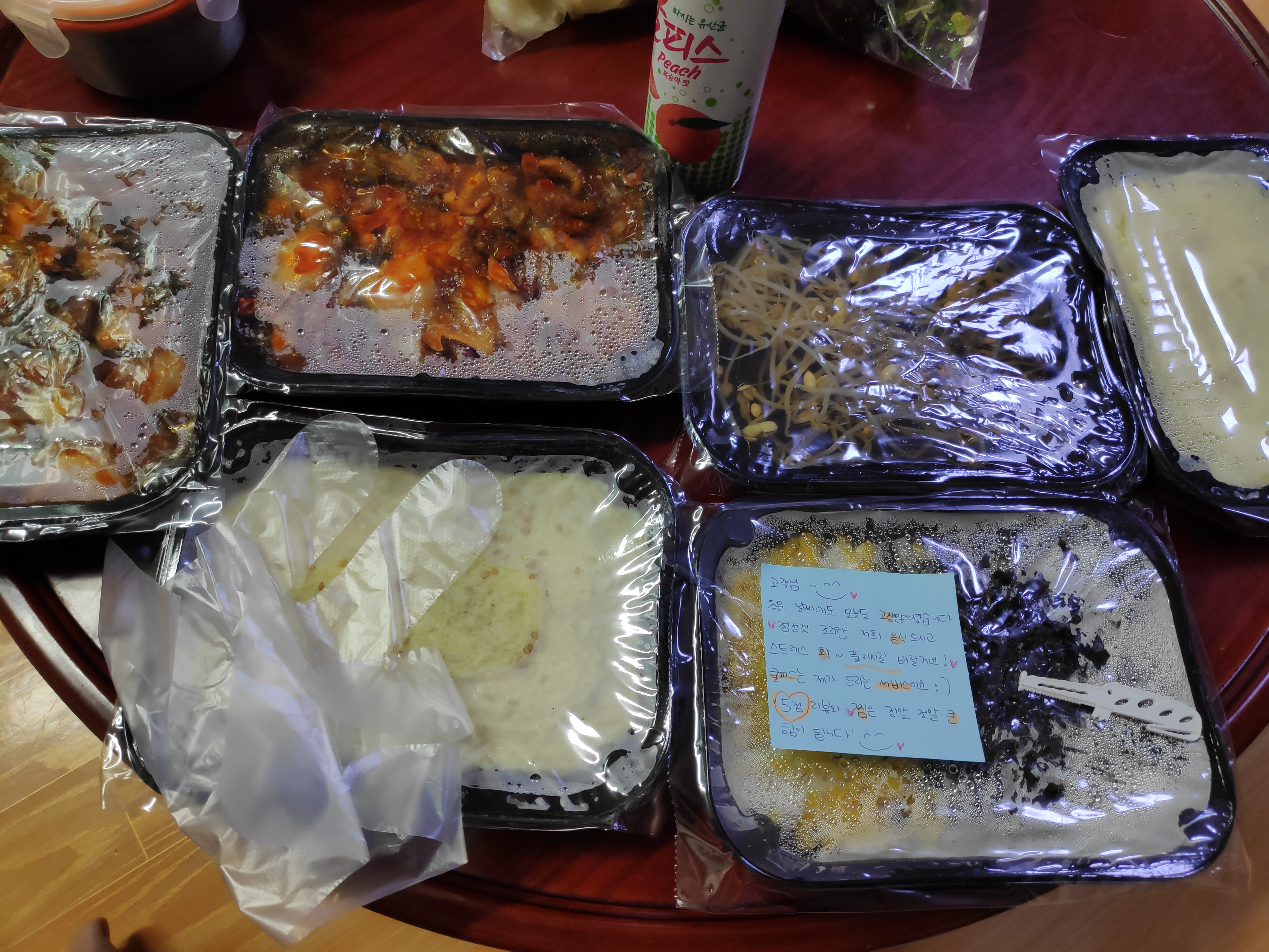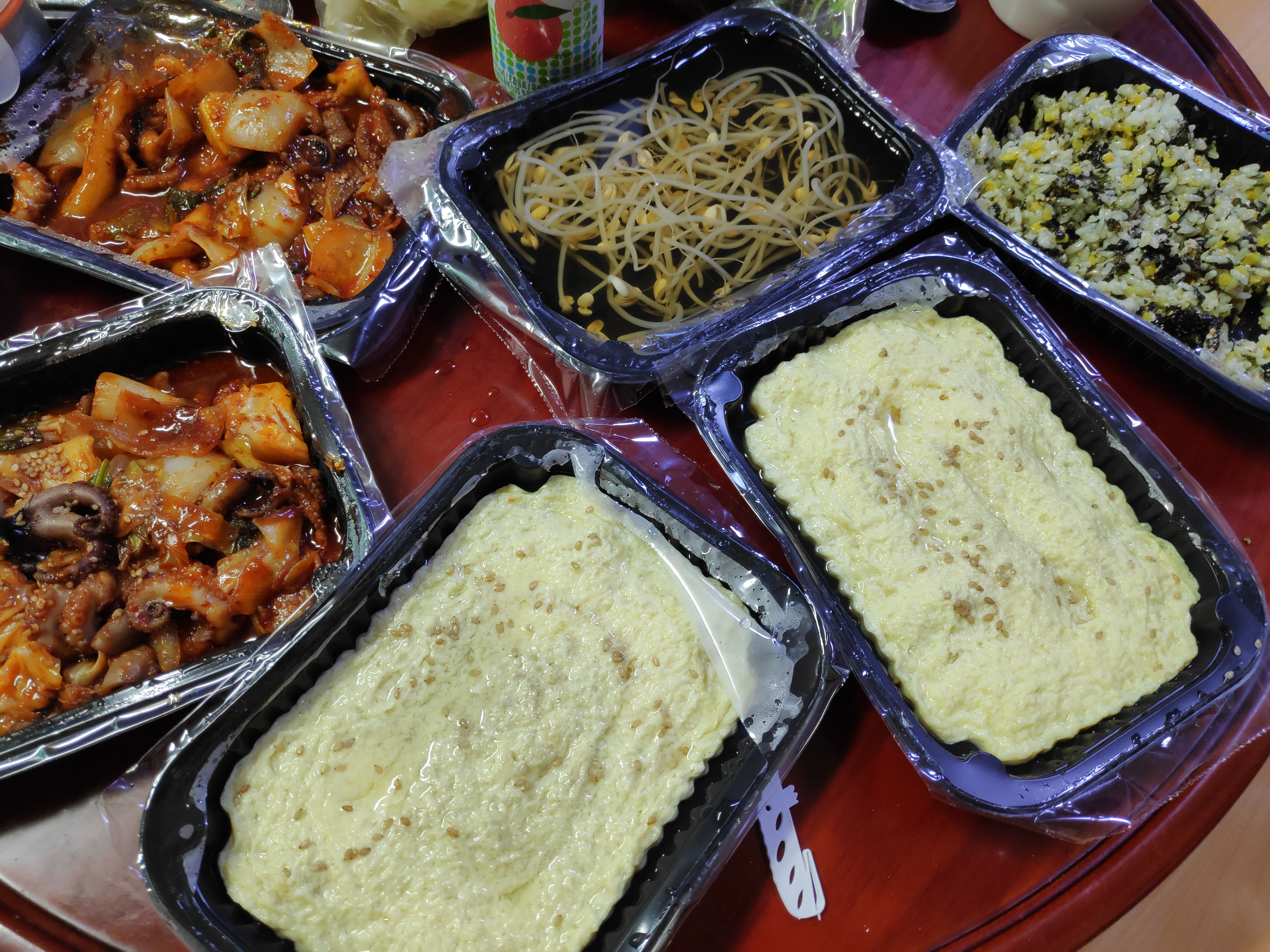 구성은 쭈꾸미 2세트랑 계란찜 2개(하나 추가 주문 990원), 주먹밥, 콩나물국, 쿨피스, 각종 쌈이었어요.