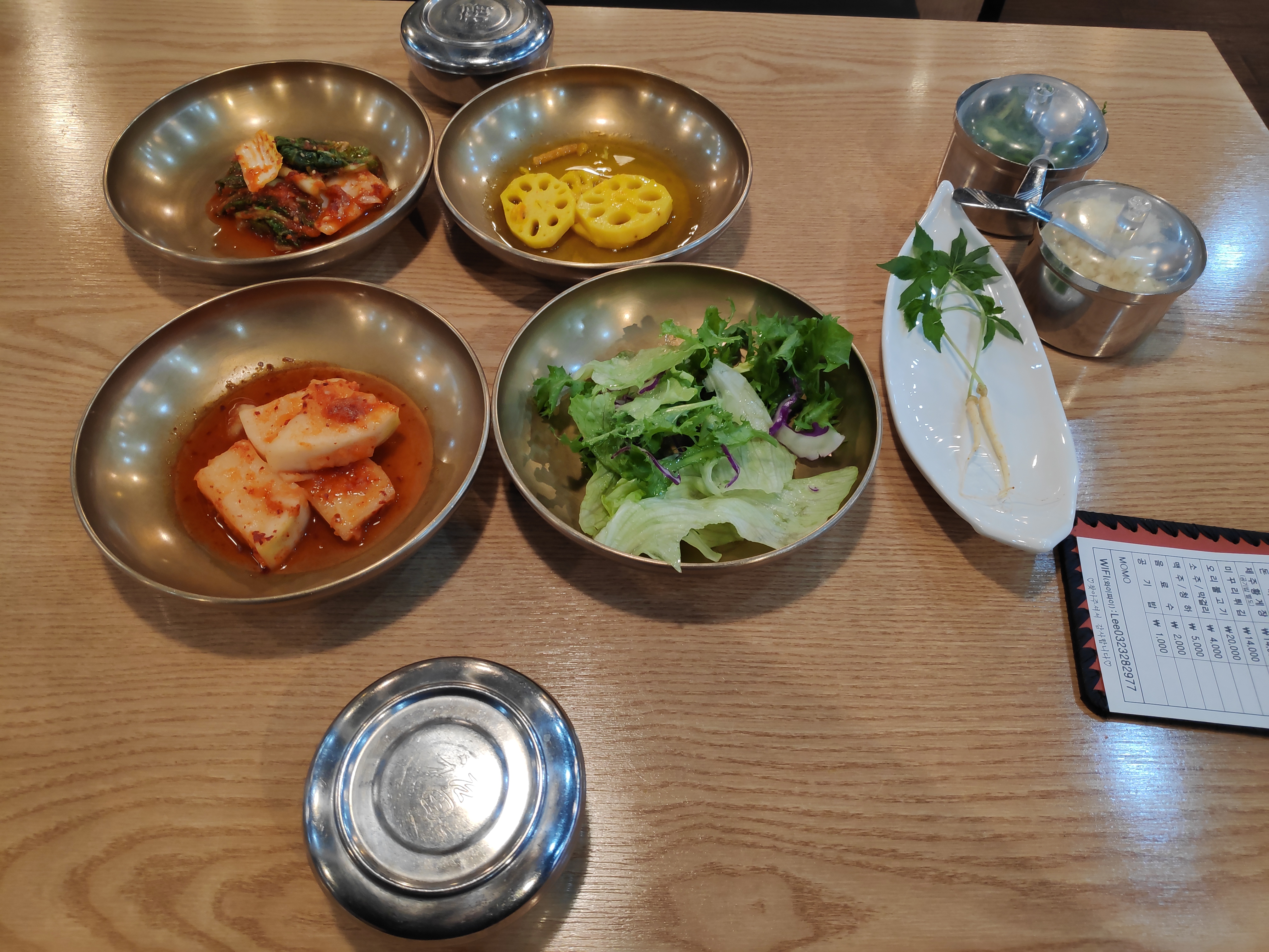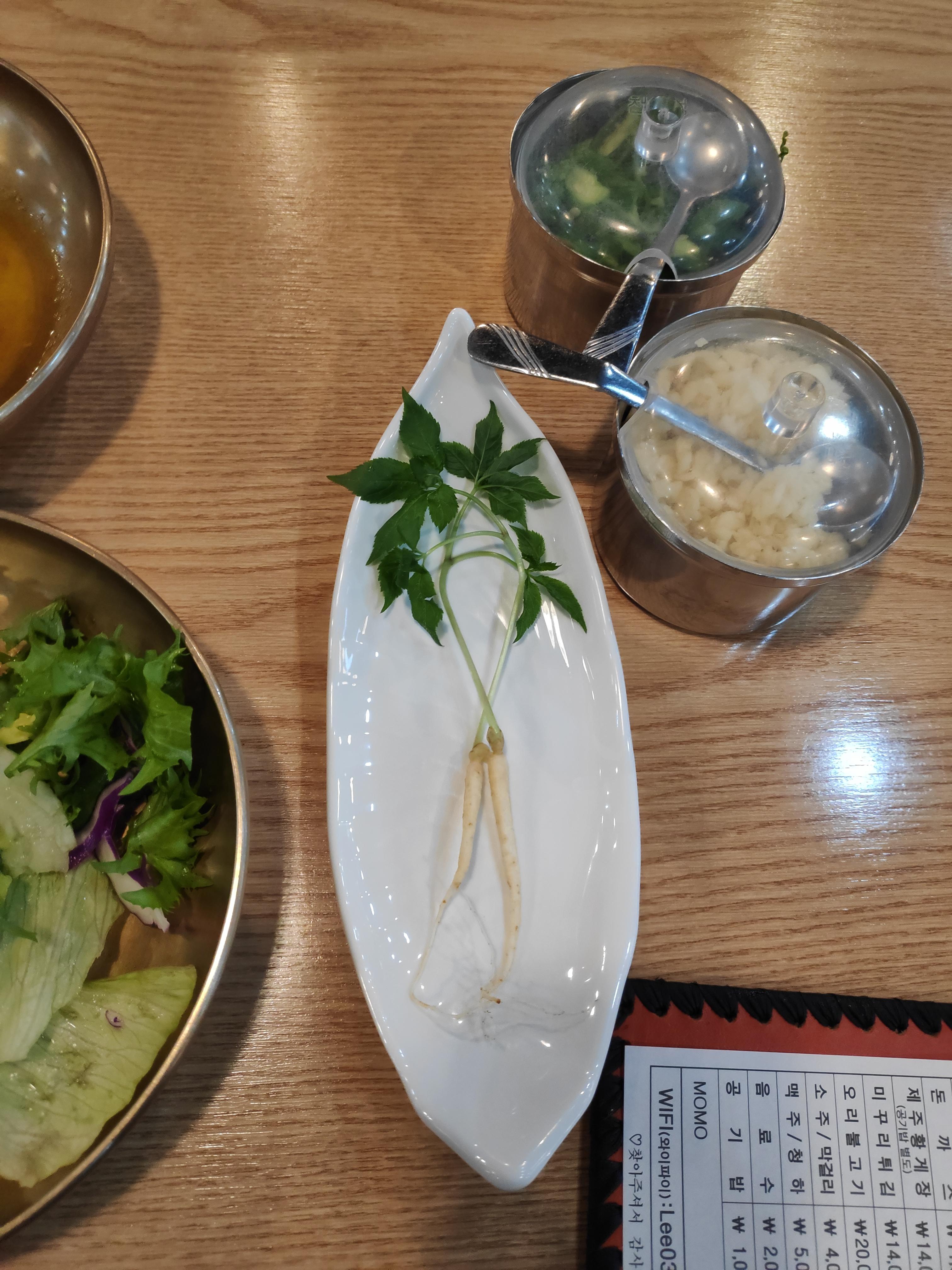 겉절이랑 샐러드, 그리고 너무 아삭한 연근과 도라지 같아 보이는 뿌리를 줬어요.
